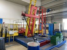 Hydraulischer Hub-Schwenktisch / Montagevorrichtung (Sonderanlage) für Brennstoffzellen, mit Schwenkmechanismus und Hubfunktion, stabile Stahlkonstruktion, Plattformanlage mit Schutzumhausung und Zugangseinrichtung