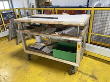 1 Alu-Arbeitstisch, m. Holzauflage, ca. 1.300 x 770 mm, Arbeitshöhe: ca. 1.000 mm, fahrbar, m. Feststellbremse