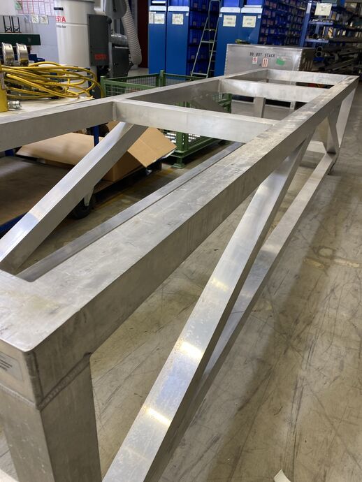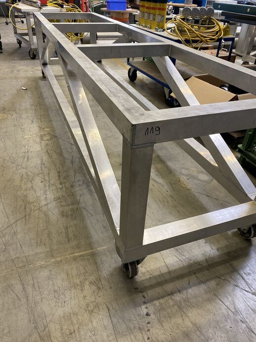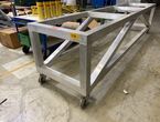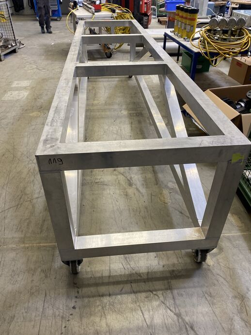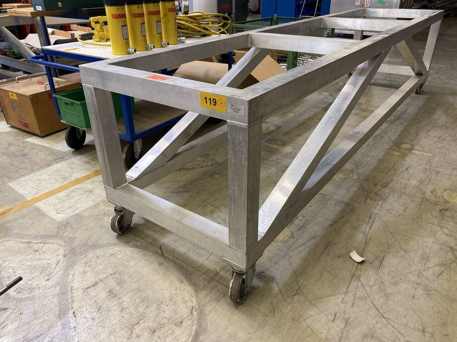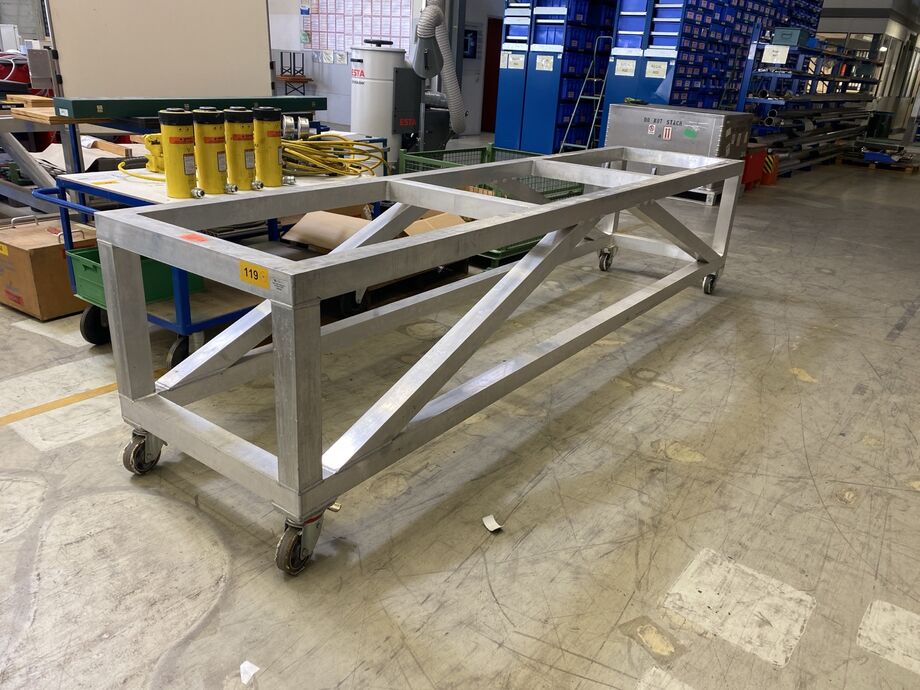 1 Alu-Transportwagen, Länge: ca. 3.600 mm, Breite: ca. 850 mm, Höhe : ca. 850 mm, m. Rädern, m. Feststellbremse