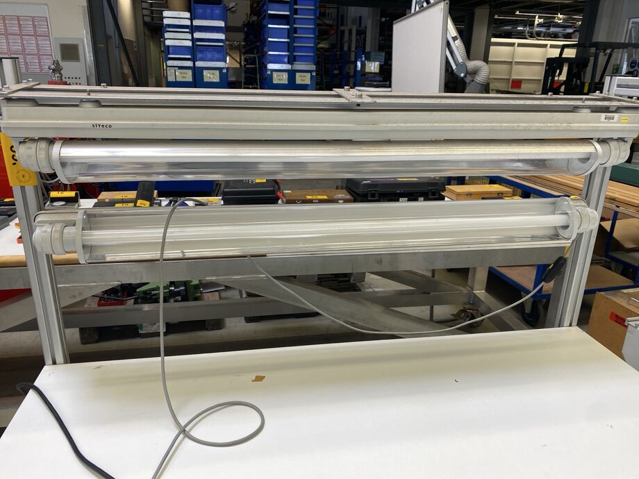 1 Arbeitstisch, Alu, elektrisch höhenverstellbar, ca. 1.350 mm x 800 mm, m. 2 Arbeitsleuchten