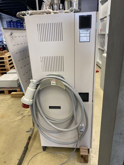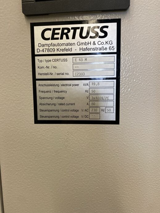 1 Dampferzeuger, Fabr. Certuss, Typ: E 48 M, Ser.-Nr.: E2383, Dampfleistung: ca. 48 kg/h, Anschlussleistung: ca. 49,8 kVA, 50 Hz, Länge: ca. 900 x 750 mm, Höhe: ca. 2.100 mm