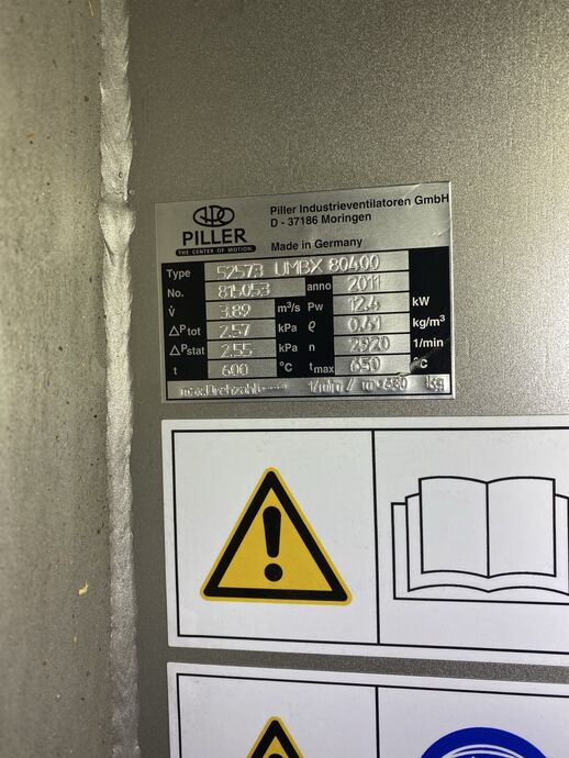 1 Einbaulüfter (Hochtemperatur-Industrieventilator), Fabr. Piller, Typ: 52573 UMBX 80400, Bj: 2011, 12,4 kW, 3,89 m³/s, 0,41 kg/m³, 2920 1/min, Betriebstemperatur: 600°C, (max. 650°C), m. Edelstahlaufnahme, Elektromotor, Flanschdurchmesser: ca. 110 mm