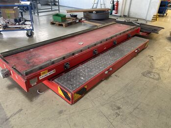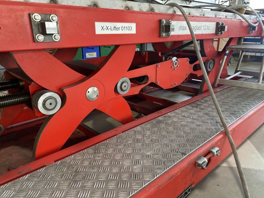 1 Hebevorrichtung (S-Hubtisch), Fabr. Reiter, TK: ca. 10.000 kg, Gew.: ca. 2.650 kg, hebbar, m. Winkelgetriebe, Länge: ca. 3.400 mm, Schienenbreite: ca. 750 mm, m. Luftkissenaufnahme, m. Anschlagösen zum Transport