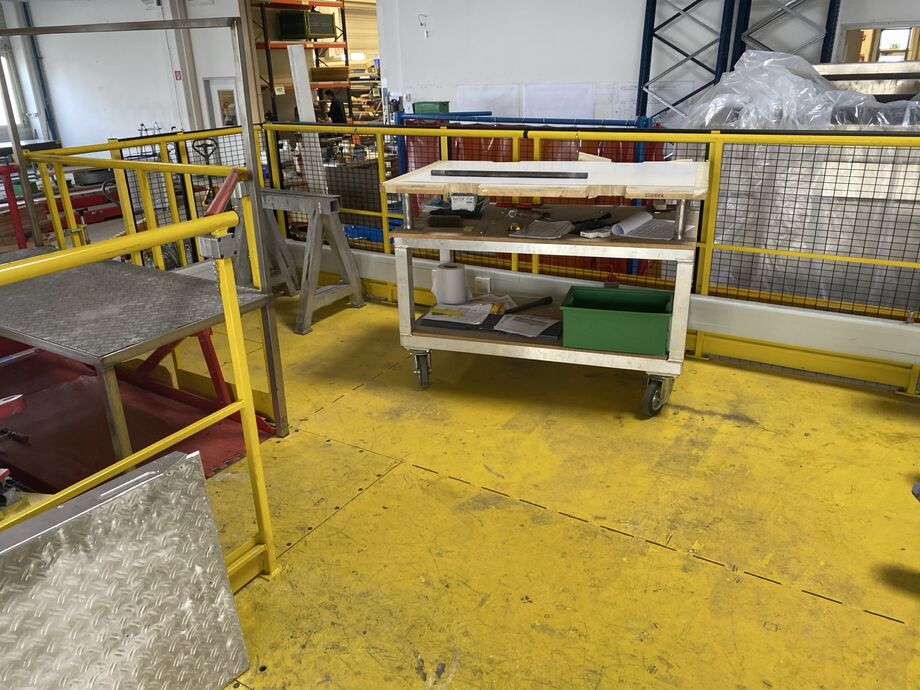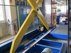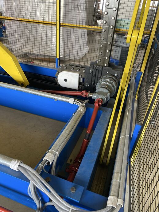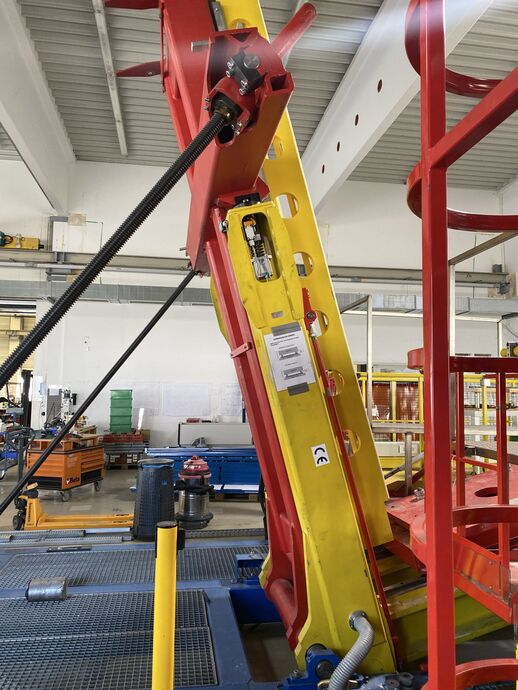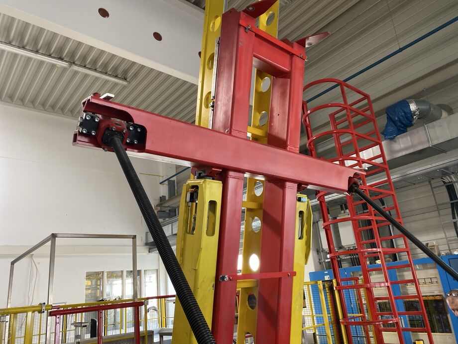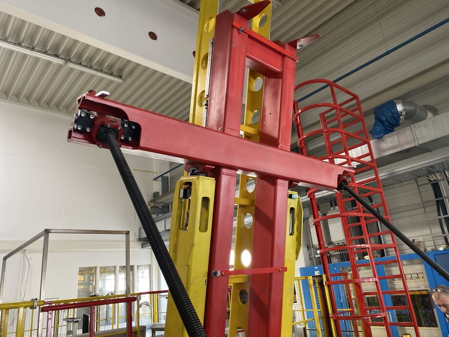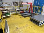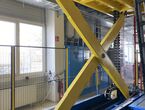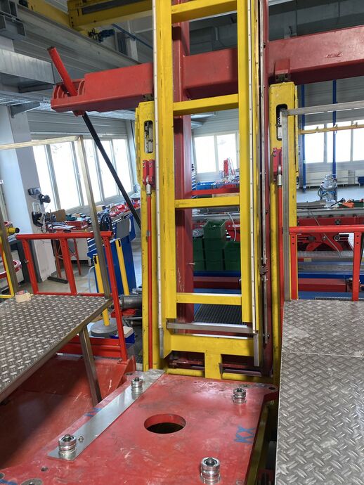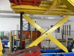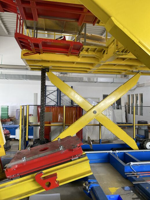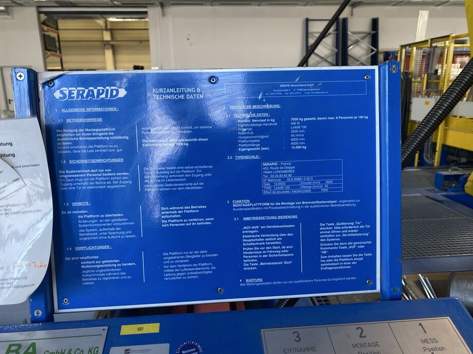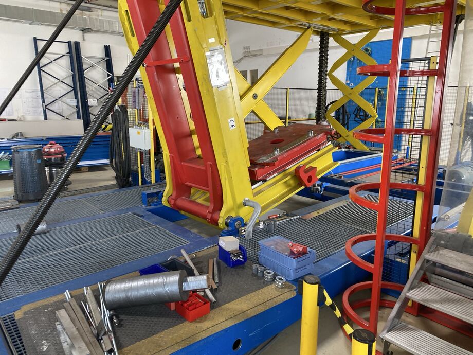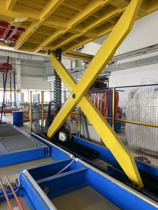 Hydraulischer Hub-Schwenktisch / Montagevorrichtung (Sonderanlage) für Brennstoffzellen, mit Schwenkmechanismus und Hubfunktion, stabile Stahlkonstruktion, Plattformanlage mit Schutzumhausung und Zugangseinrichtung