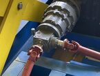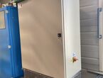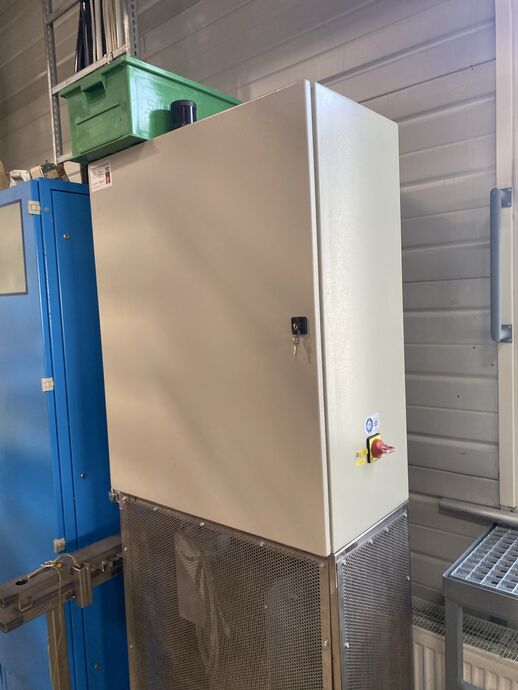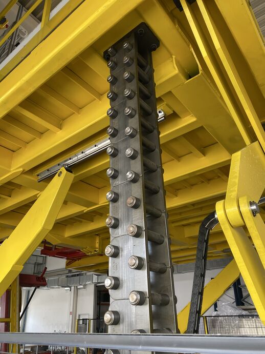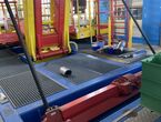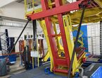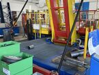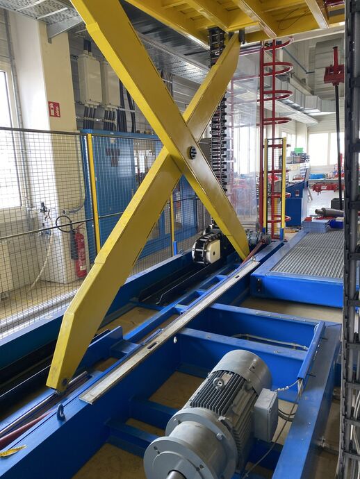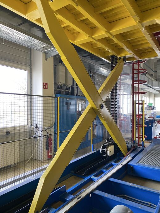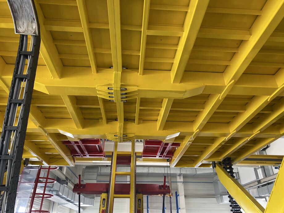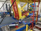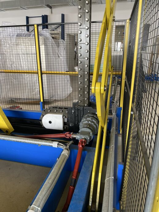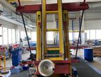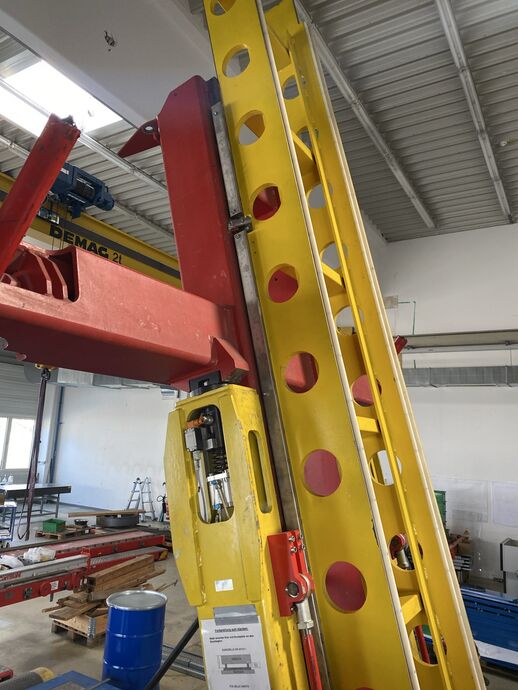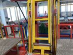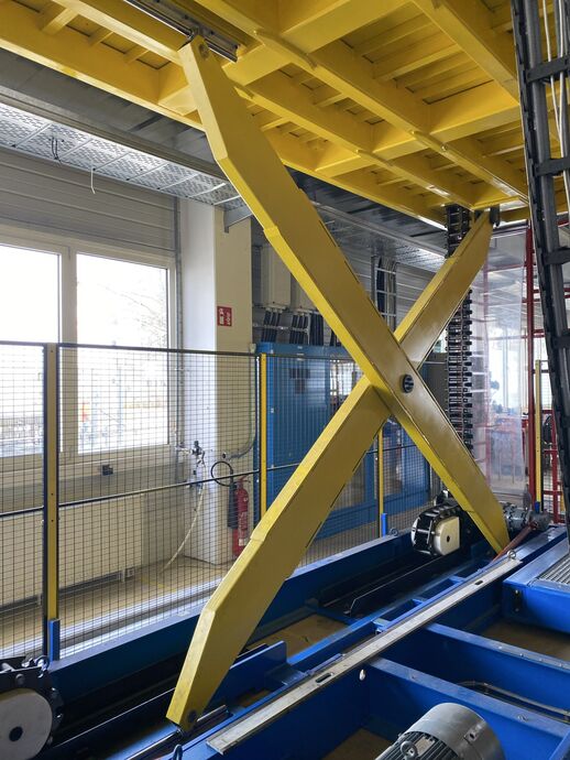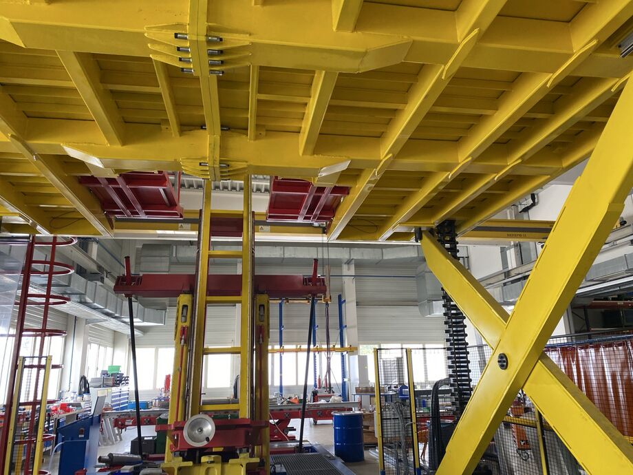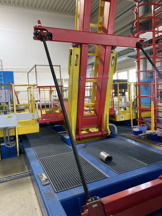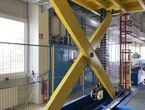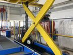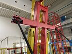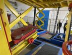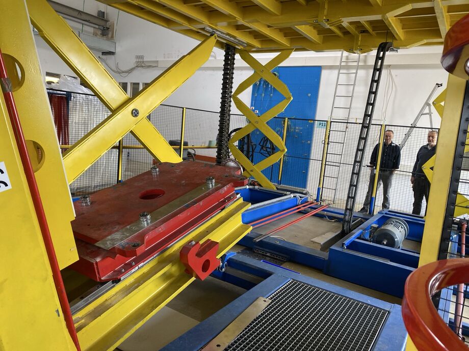 Hydraulischer Hub-Schwenktisch / Montagevorrichtung (Sonderanlage) für Brennstoffzellen, mit Schwenkmechanismus und Hubfunktion, stabile Stahlkonstruktion, Plattformanlage mit Schutzumhausung und Zugangseinrichtung