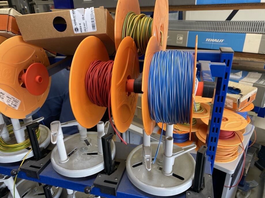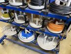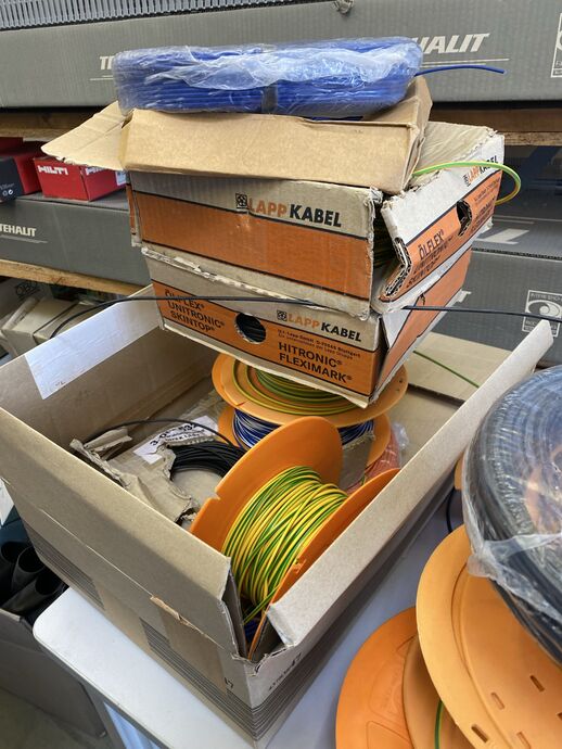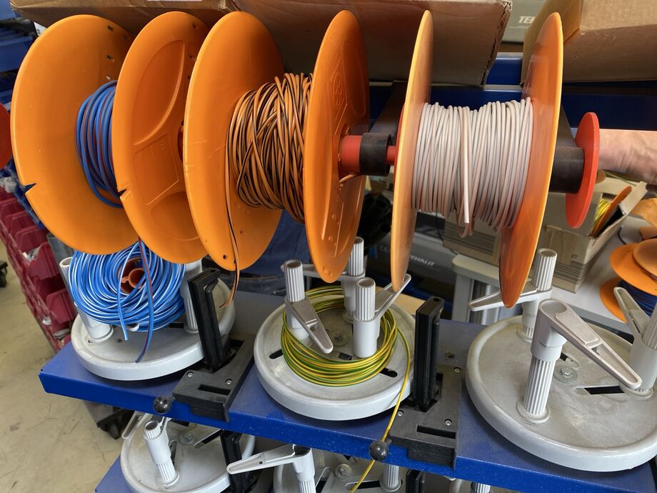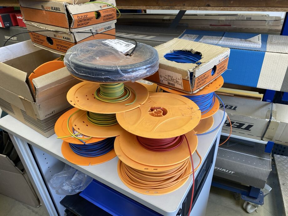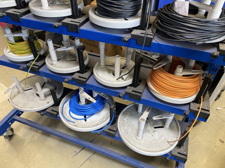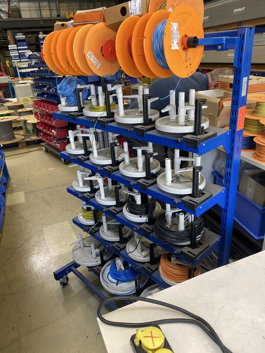 1 Kabelabrollwagen, fahrbar, für Adernleitungen, m. 19 Abrolltellern und 1 Posten div. Flexkabel