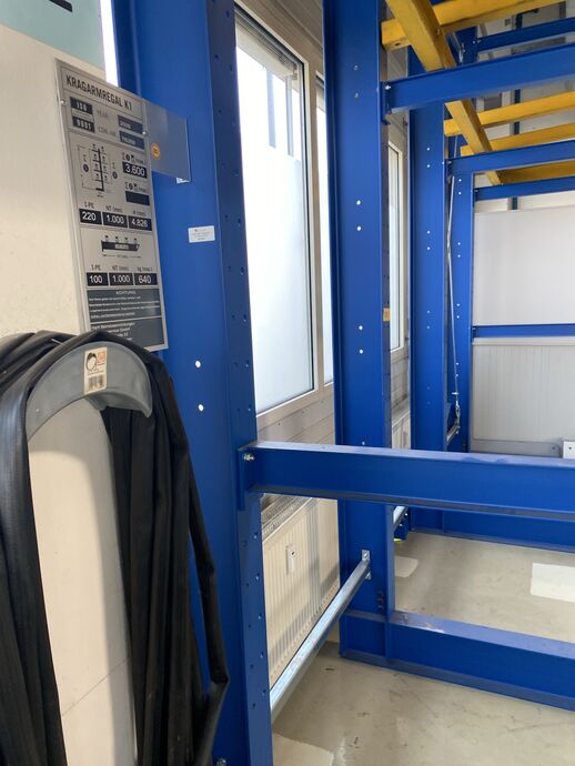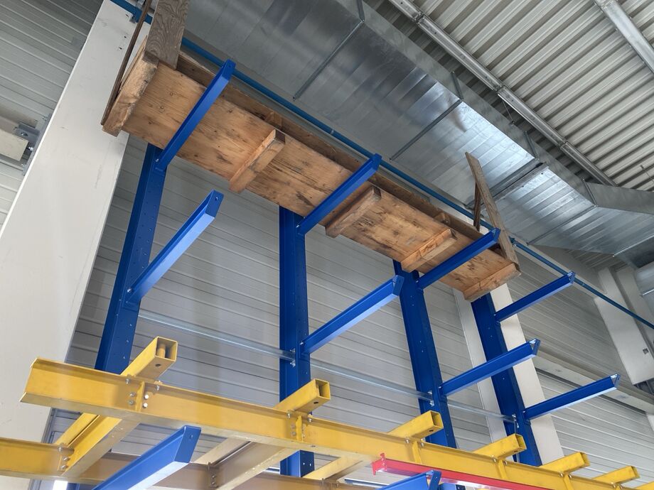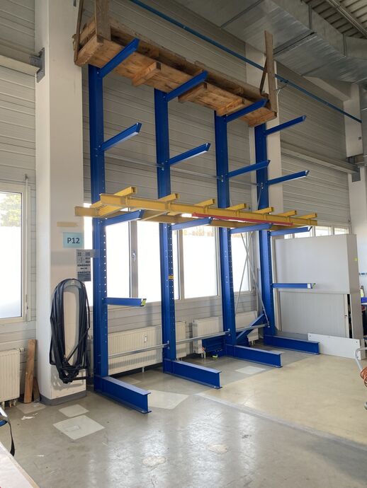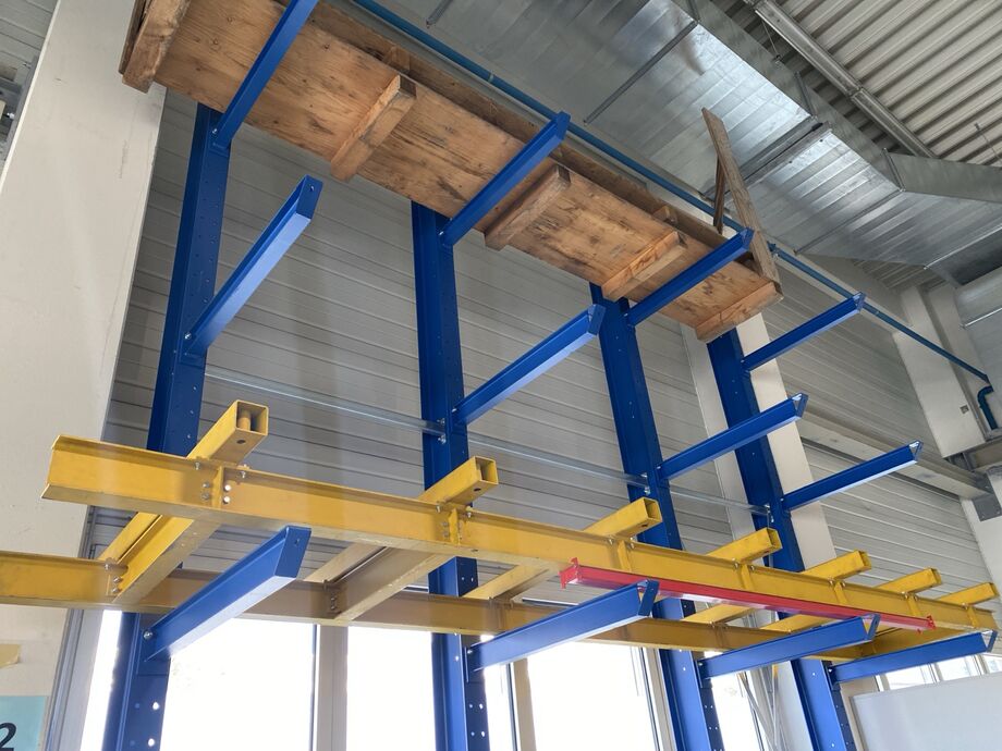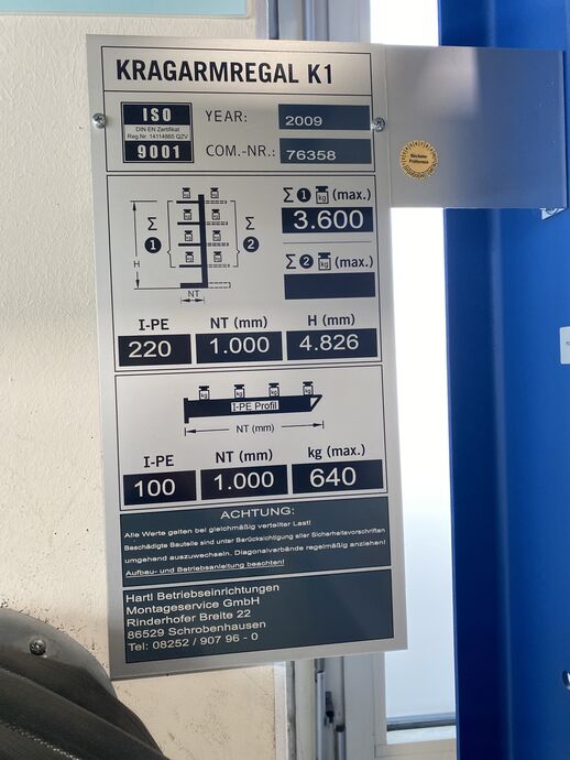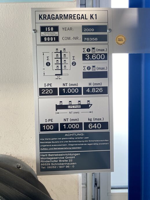 1 Schwerlast-Kragarmregal, Fabr. Hartl, Typ: K1, Höhe: ca. 4.826 mm, Breite: ca. 4.060 mm, m. 16 Traversen, m. 1.000 mm, Tk: max. ca. 3.600 kg